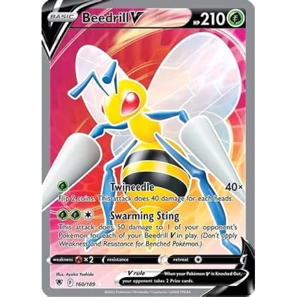 Beedrill V card is a Grass type and is a Basic Pokémon with a solid HP of 210. Beedrill V offers a versatile set of abilities. Its first attack, “Twineedle,” requires a single Grass Energy and adds an element of chance by flipping two coins. For each head, this attack inflicts 40 damage, potentially delivering substantial blows.